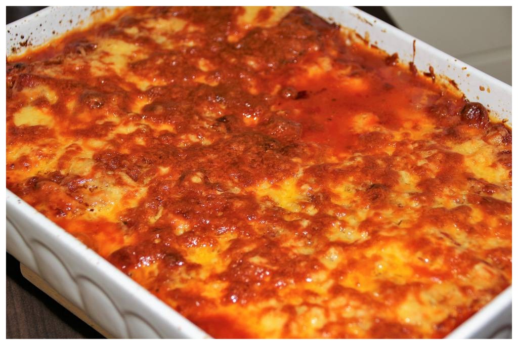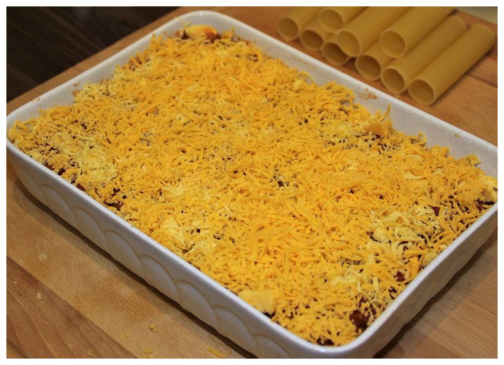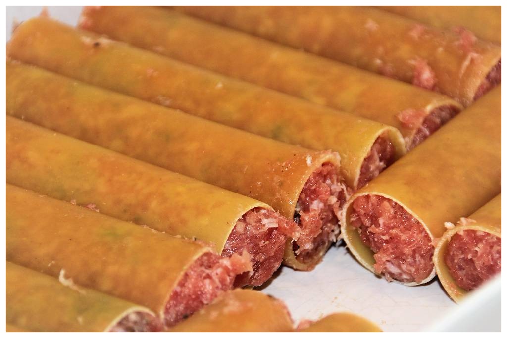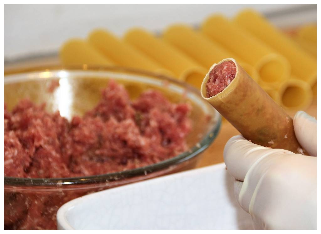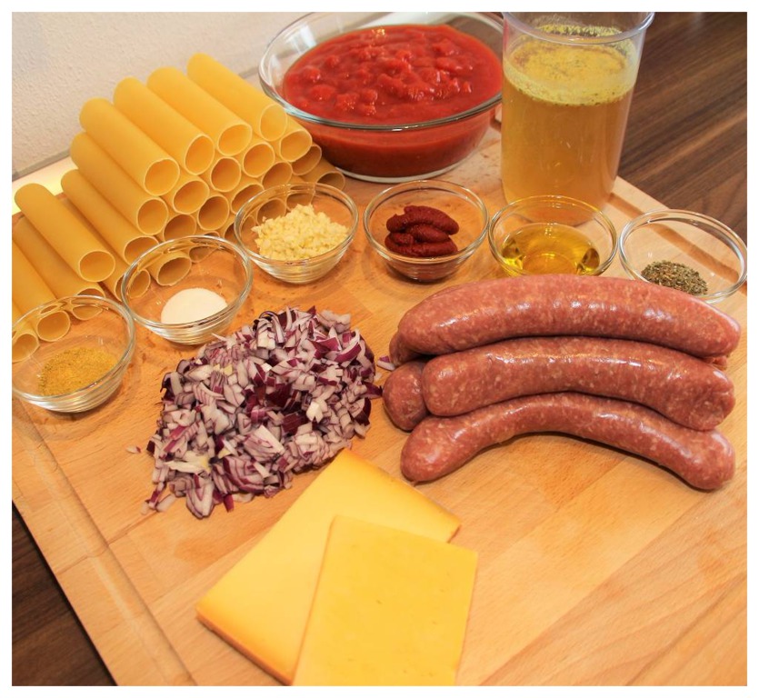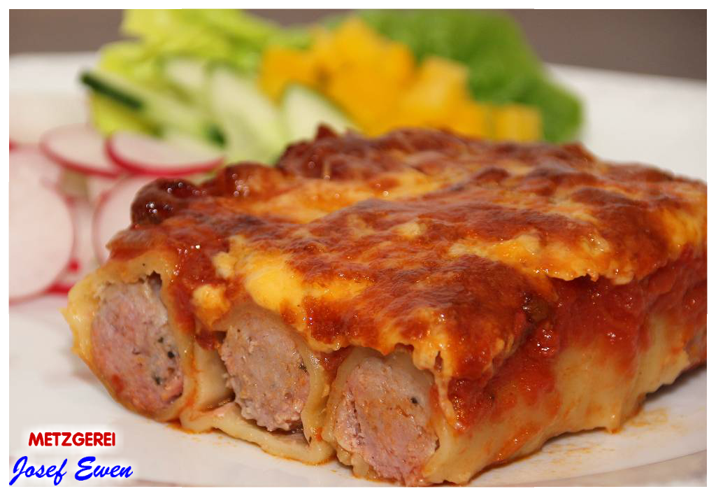 In der Zwischenzeit Brät aus den Wurstpellen in eine Schüssel drücken. Majoran, Basilikum und Thymian dazu geben und gut vermengen. Cannelloni mit dem Brät füllen und in einer Auflaufform dicht aneinanderlegen. Fertige Tomatensoße darüber geben. Käse darüber reiben. Im Ofen bei 180° Grad (Umluft) ca. 35-40 Minuten fertigbacken. Mit Salatbouquet servieren.