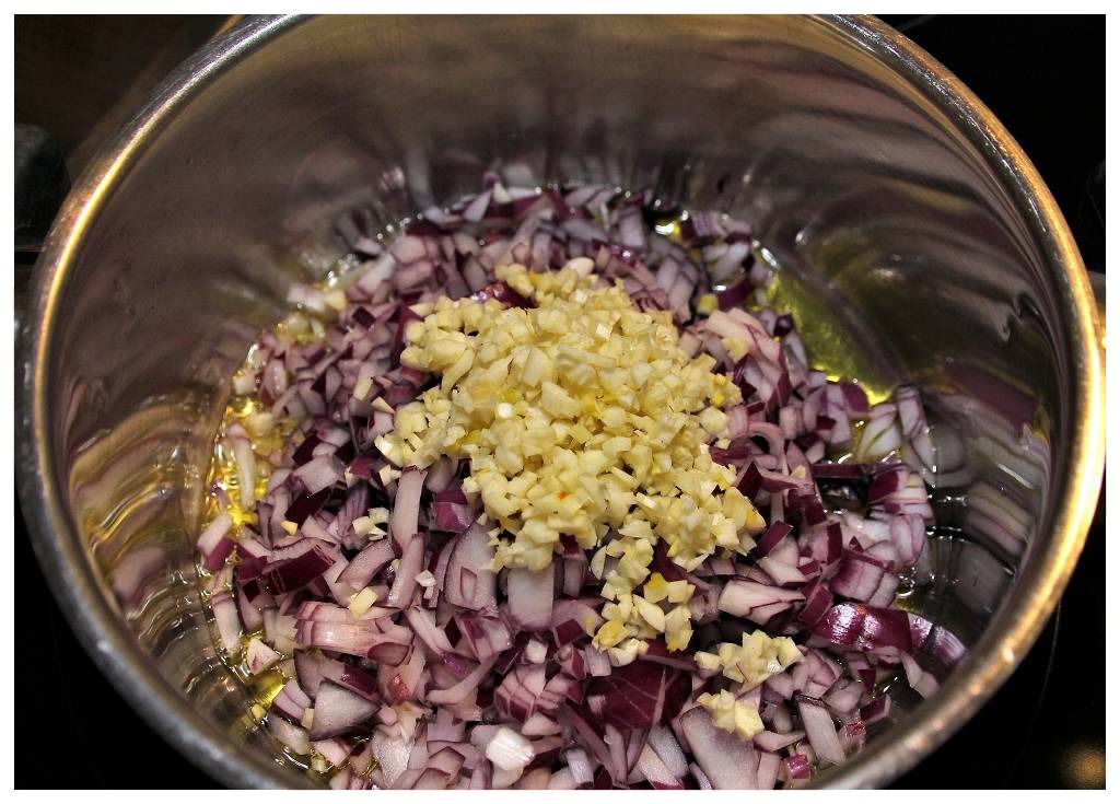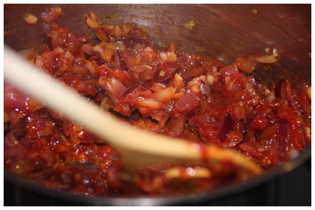 In einem großen Topf fein gehackte Zwiebeln und Knoblauchzehen im Olivenöl scharf anbraten. Anschließend indische Gewürzmischung, Zucker, Tomatenmark, fein gehackte Tomaten und Brühe hinzugeben. Aufkochen, anschließend ca. 10 Minuten auf kleiner Hitze weiter köcheln lassen. Ggf. mit etwas Pfeffer und Salz abschmecken.