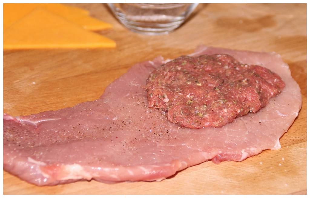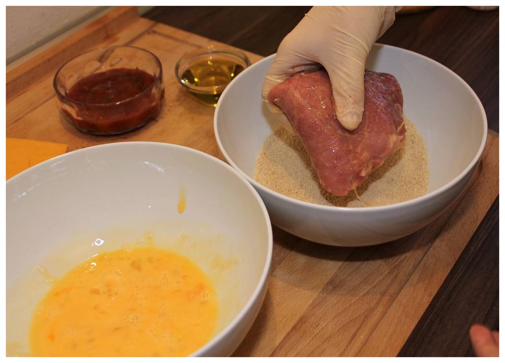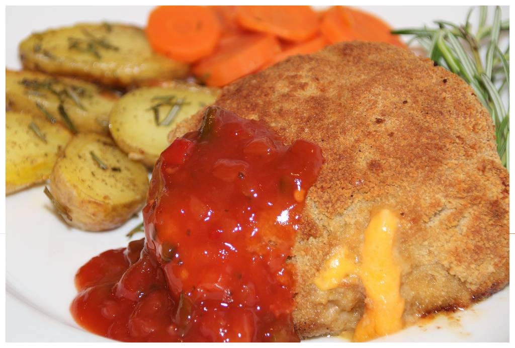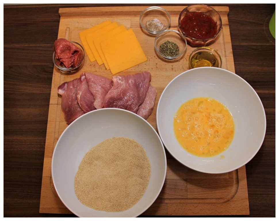 Aus diesem „Drei-Länder-Cordon-Bleu“ (Schwein und Zwiebelmettwurst aus der Eifel, Gewürzmischung italienische Art und Cheddar aus Irland) wird kinderleicht ein pikantes „Vier-Länder-Cordon-Bleu“: Einfach kurz vor dem Servieren etwas mexikanische Salsa-Sauce hinzugeben.