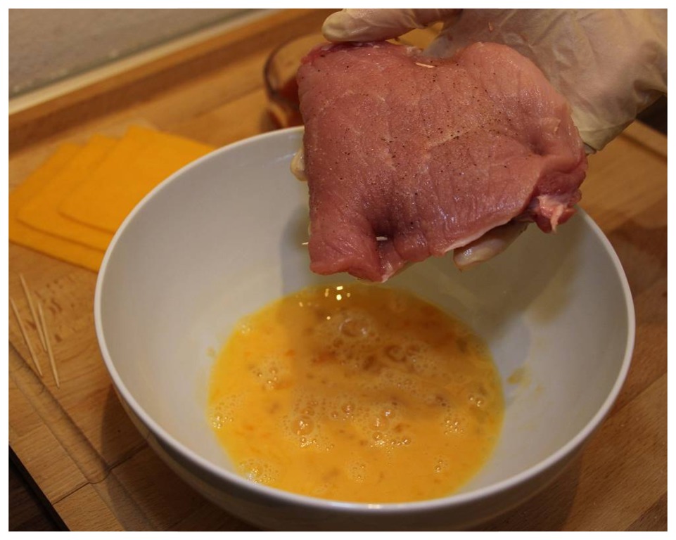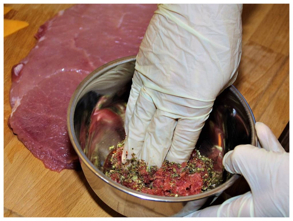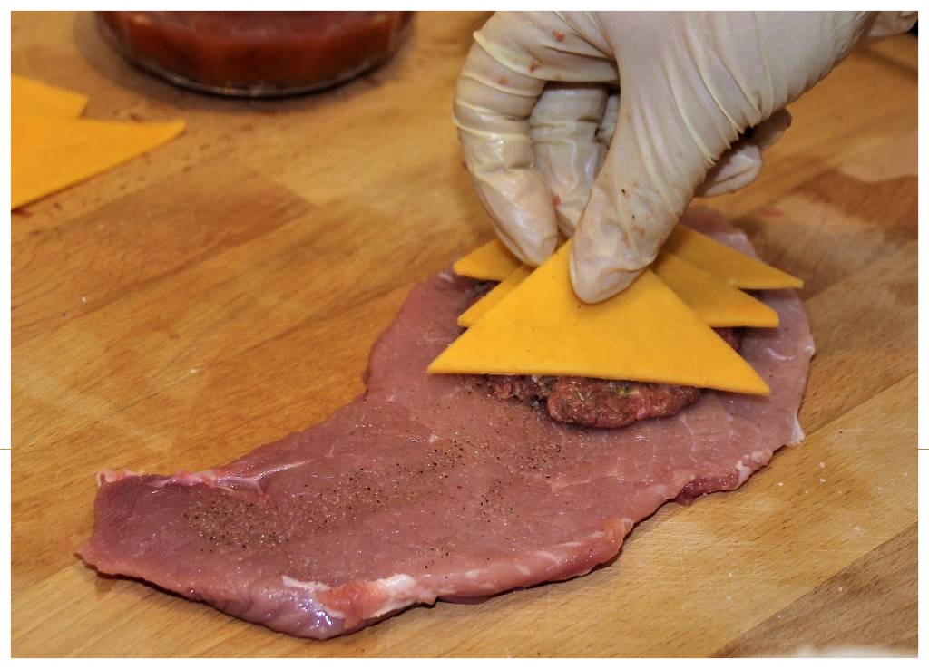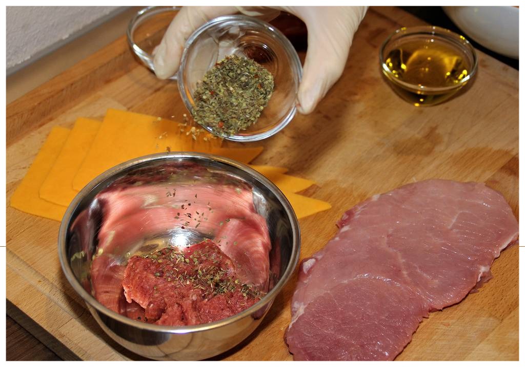 Schnitzel ausbreiten und platt klopfen, mit Salz und Pfeffer würzen. Basilikum, Oregano, Majoran, Thymian und Chiliflocken mit der Zwiebelmettwurst vermengen. In vier Portionen aufteilen. Die Cheddar-Scheiben in vier Dreiecke schneiden. Zwiebelmettwurst und Käse auf einer Hälfte des Schnitzels verteilen. Schnitzel zusammenklappen und ggf. für mehr Stabilität mit Zahnstochern verschließen.