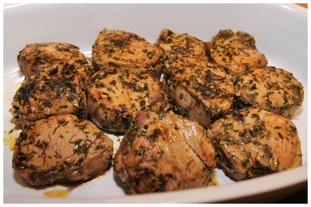 Das Schweinefilet in etwa gleich große Medaillons schneiden. Estragon, Thymian u. Paprika edelsüß zu einer Marinade vermengen und die Medaillons damit gleichmäßig bestreichen. Die Medaillons in einer Pfanne von beiden Seiten jeweils zwei Minuten anbraten und in eine Auflaufform geben.