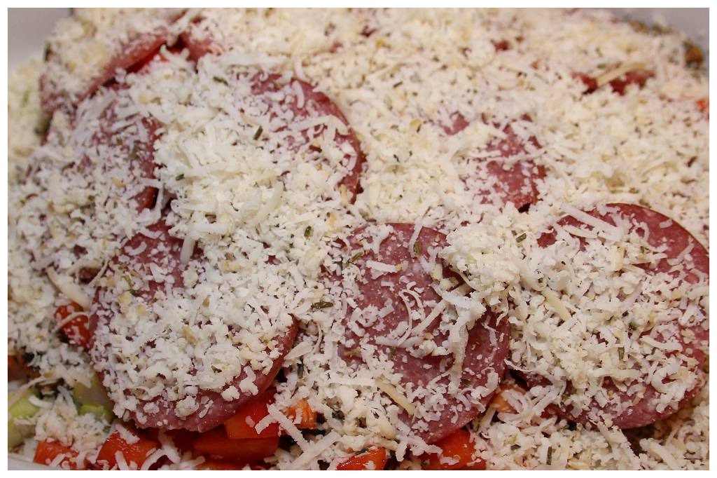 Die Lauchzwiebeln und die Paprika klein schneiden, auf den Schweinemedaillons verteilen, darüber die Salamischeiben legen. Den Ziegenhartkäse fein reiben und nach Belieben etwas frisch gezupften und klein gehackten Rosmarin hinzugeben. Den geriebenen Käse gleichmäßig über die Salamischeiben streuen.